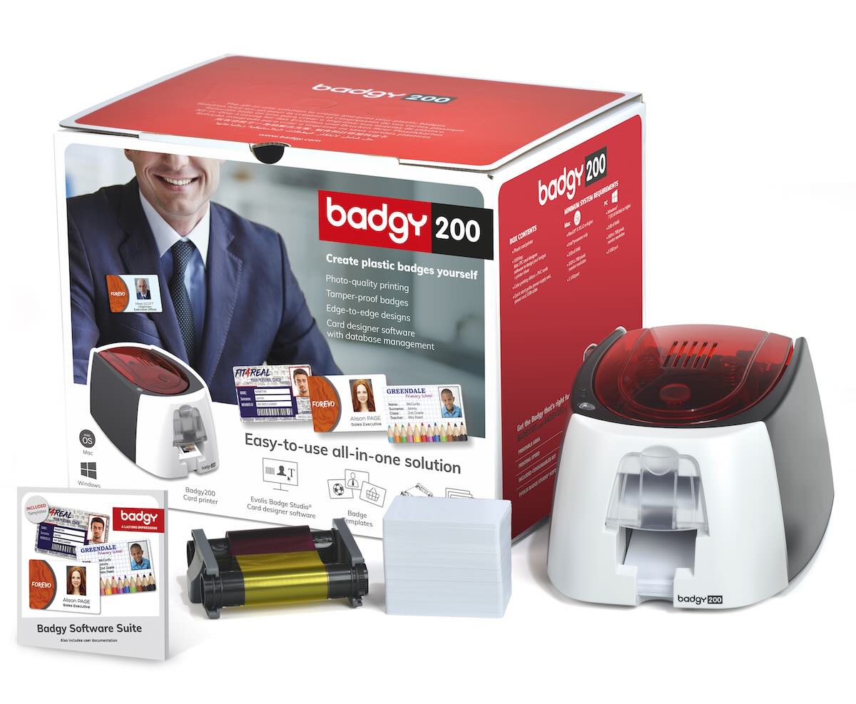 Impresora de tarjetas de plástico con software de personalización de tarjetas Evolis Badge Studio® (para PC o Mac), con una biblioteca de tarjetas gratuita en línea y un paquete de consumibles (cinta de color y tarjetas de plástico en blanco).